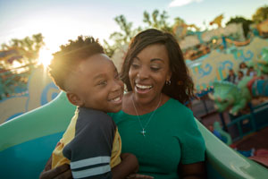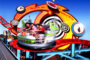 Fly high on a dinosaur around a twirling tin-toy top at this delightful carnival-inspired attraction.